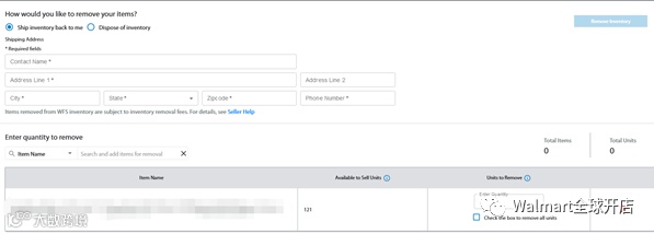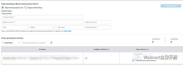 目前移仓可以在后台直接申请移仓,点击WFS版块的ManageInventory,输入SKU或是itemid,选中。即可操作移仓或是销毁,选择移仓需要输入地址。需要至少30天的处理时间。
