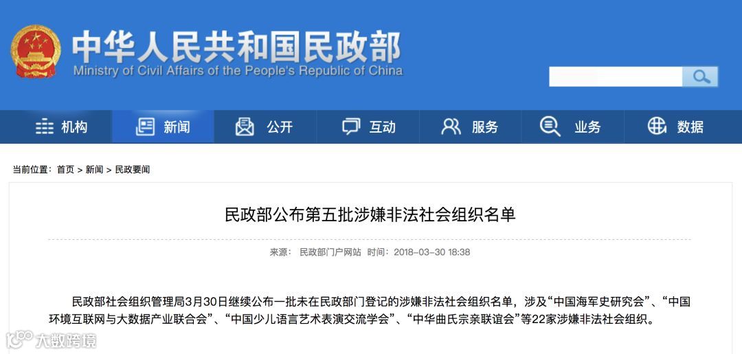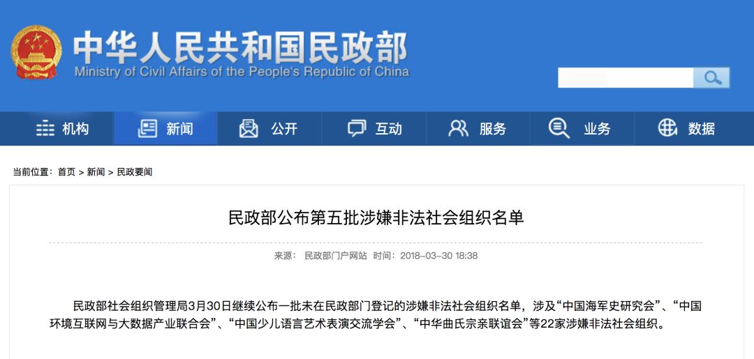 民政部社会组织管理局3月30日公布一批未在民政部门登记的涉嫌非法社会组织名单,涉及“中国海军史研究会”、“中国环境互联网与大数据产业联合会”、“中国少儿语言艺术表演交流学会”、“中华曲氏宗亲联谊会”等22家涉嫌非法社会组织。