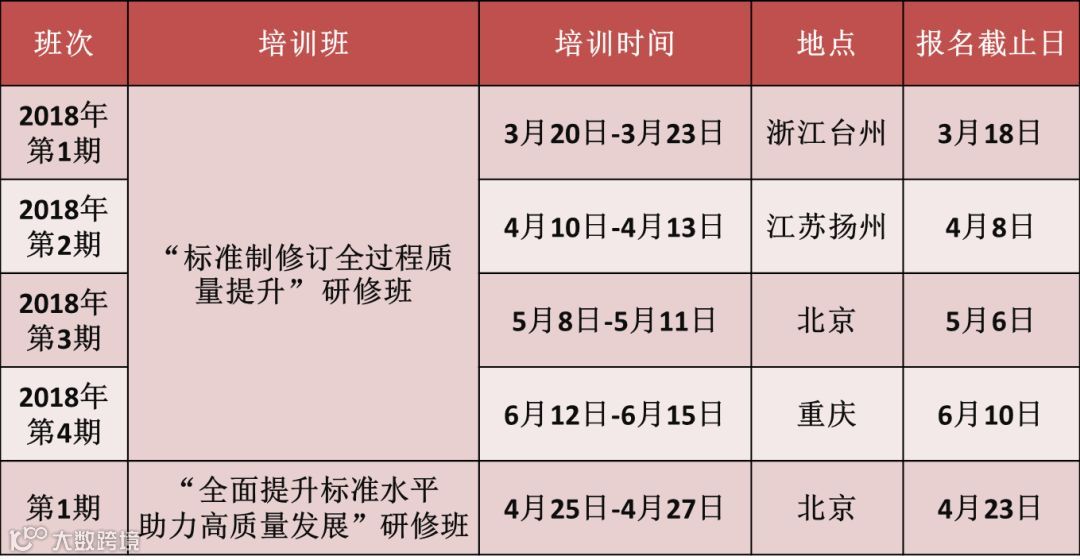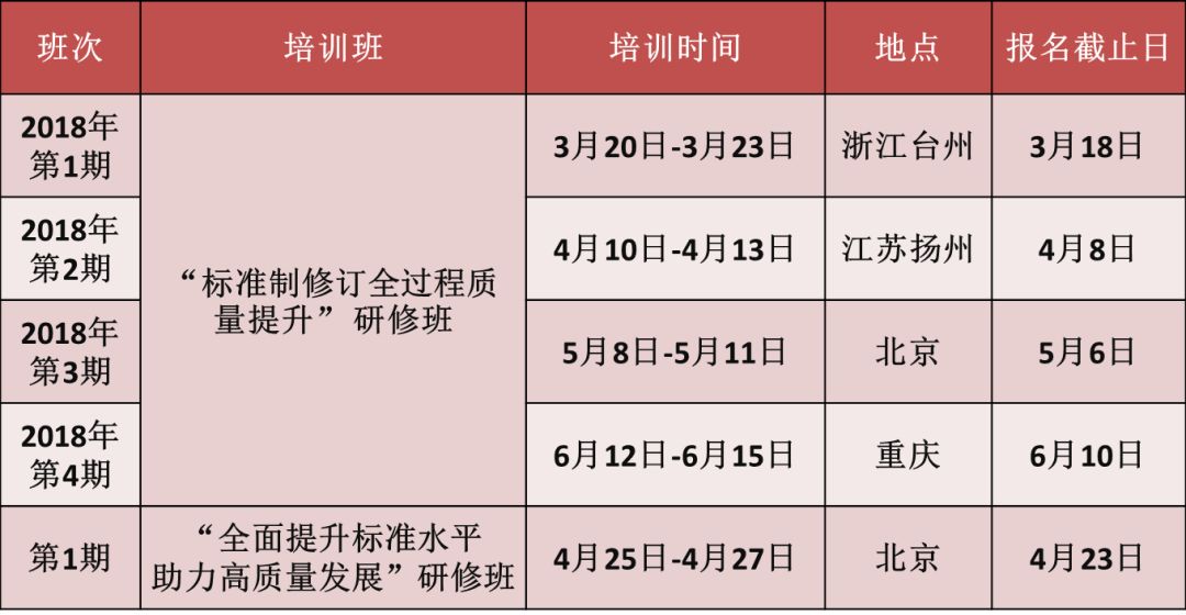 为使各有关单位了解国家标准委标准信息中心(审评中心)2018年上半年培训安排,便于大家合理安排时间,现将2018年上半年相关培训告知如下: