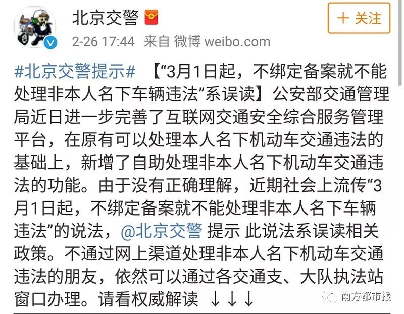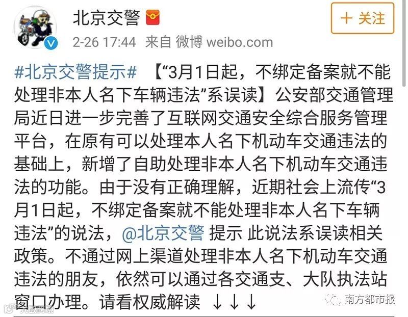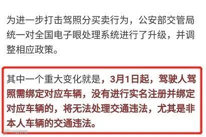 针对突如其来的扎堆办业务现象,各地交警纷纷提醒,“3月1日起,不绑定备案就不能处理非本人名下车辆违法”是误读。