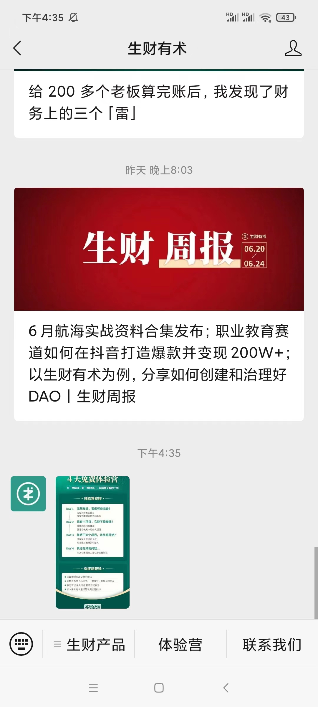 有用户体验营,体验营分享生财部分的精华,让人产生购买欲望。此外,公众号有些分享赚钱的干货文章,想看要付费,会员就可以免费看文章。