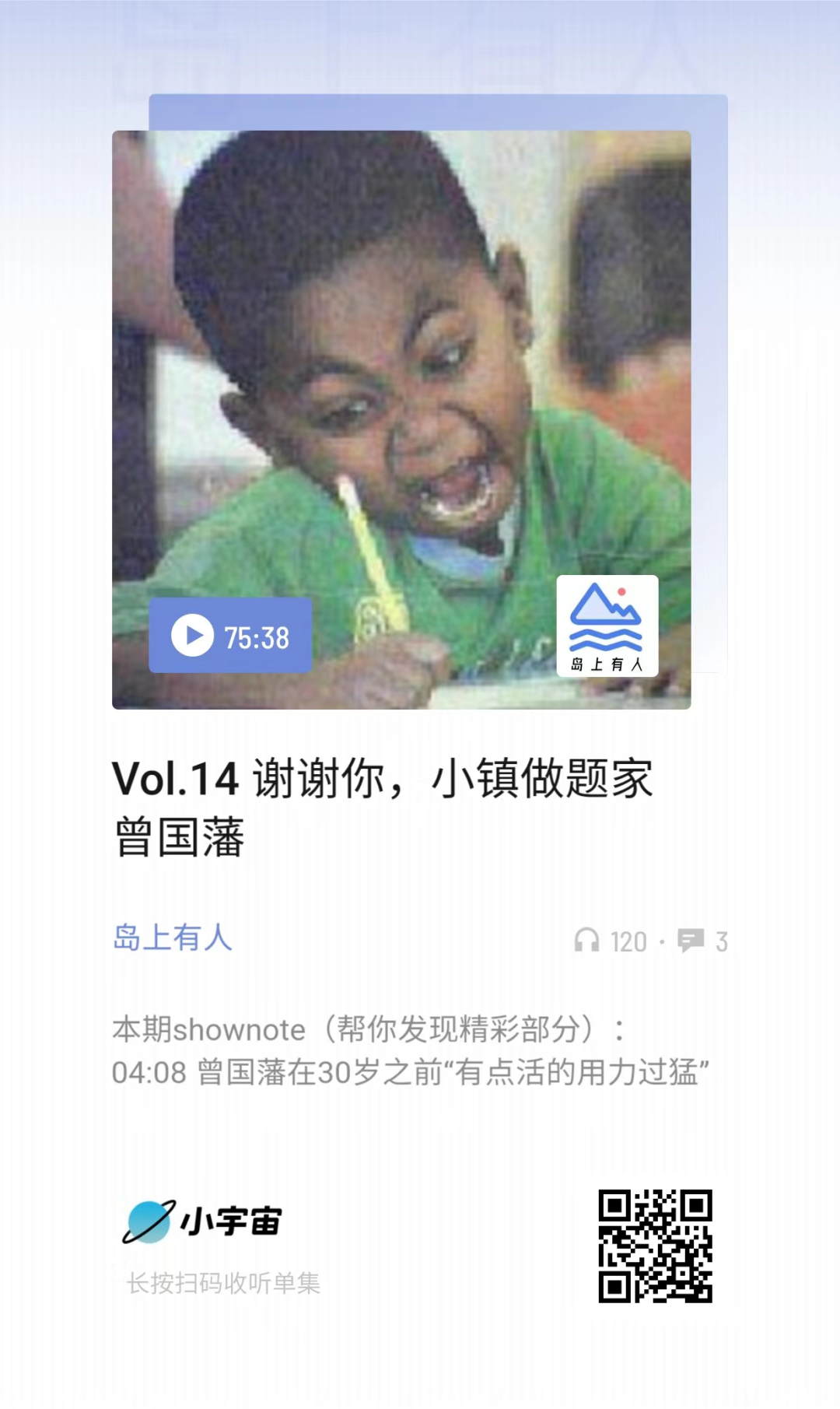 本期岛上有人播客,想跟你聊聊曾国藩和小镇做题家,你呢,你是不是小镇做题家?对于这个词的过度解读,你有什么想说的,可以评论区见哦!(PS:想进听友群,可以私信松月哦)