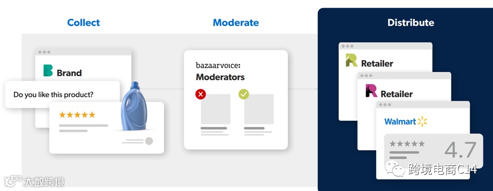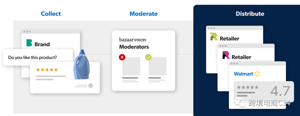 BazaarVoice与沃尔玛的合作模式和其他平台类似,第一步从已有的其他平台或站点收集UGC,Bazaarvoice会对收集的评论进行验真和筛选,通过审核的评论通过机器学习和人工校正,对应到沃尔玛相应的品类和产品上,同时也可以同步到其他与Bazaarvoice合作的电商零售平台上
