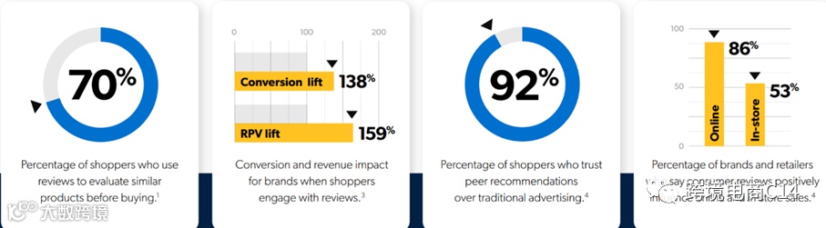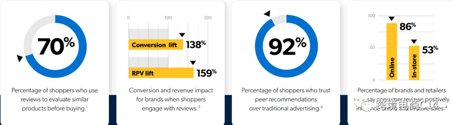 对于沃尔玛平台,70%买家通过评论作为重要进行最后的购买决策,相对于传统广告,92%消费者更相信评论内容,对于品牌拥有者来说,线上和线下销售都受到评论数量和评级的影响。
