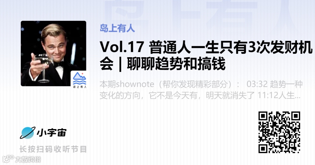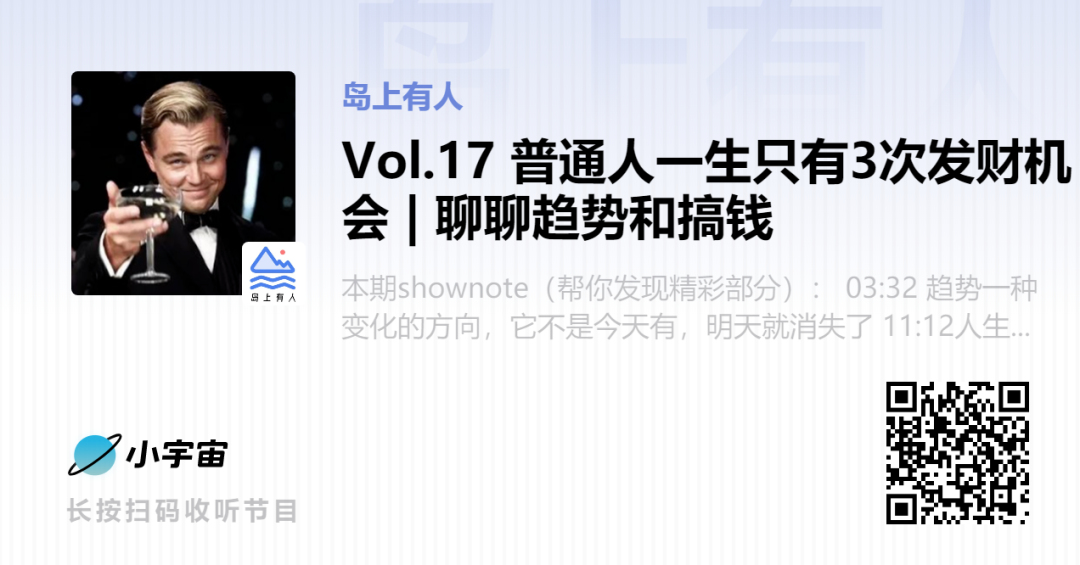 今天的文章来自松月&岛主&泡菜姐姐三个人一起做的播客节目《岛上有人》的最新节目“Vol 17 普通人一生只有3次发财机会 | 聊聊趋势和搞钱”的精华内容。如果你想听同款音频,更是欢迎(记得在小宇宙订阅节目哦,届时更新会有系统通知)↓↓↓