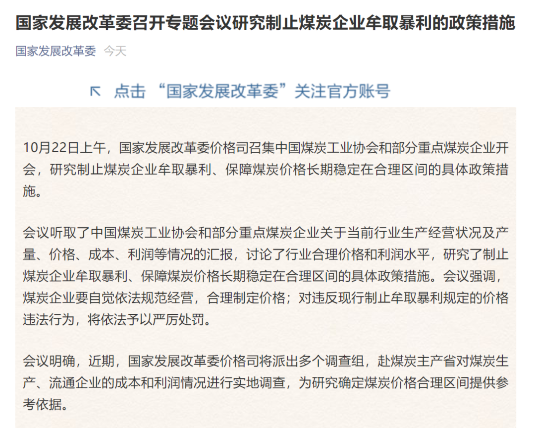 10月22日,国家发改委微信公众号发文表示,当日,国家发改委召开专题会议,研究制止煤炭企业牟取暴利的政策措施。这是继19日、20日、21日以来,国家发改委连续第4次表态煤价。