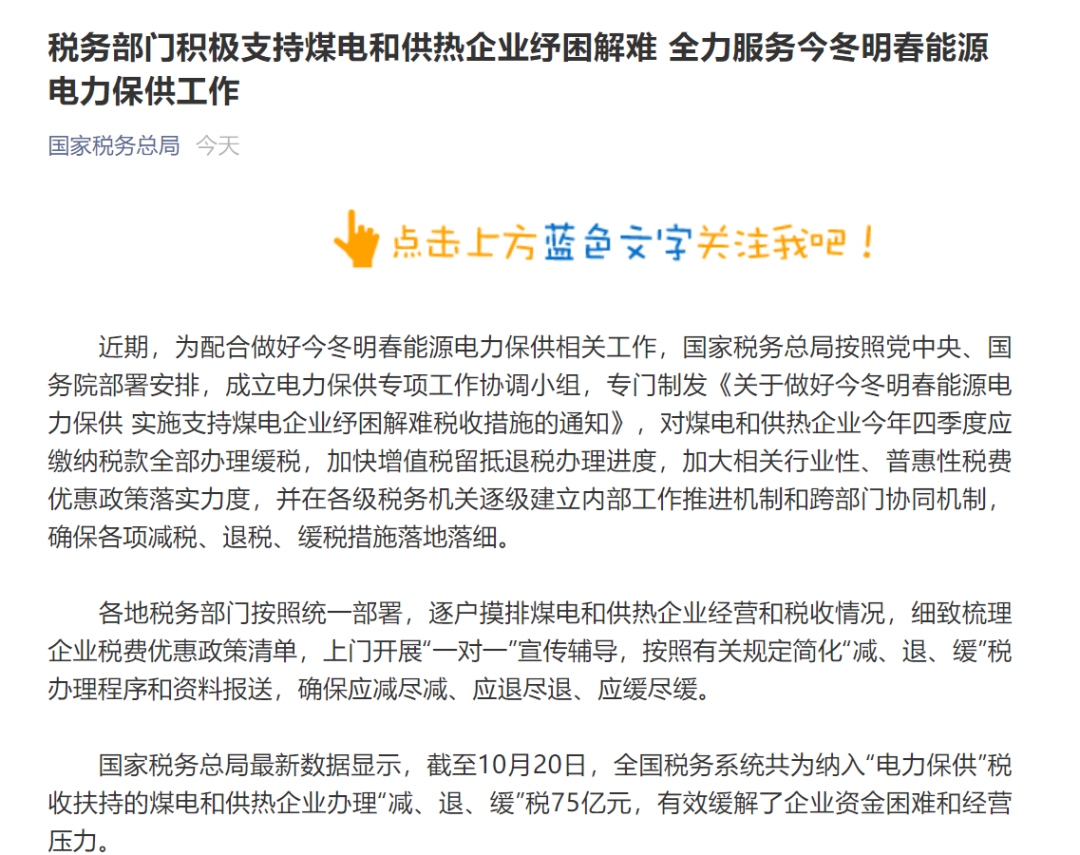 22日,国家税务总局也出手了,通知指出,煤电和供热企业可缓缴四季度应缴纳税款。