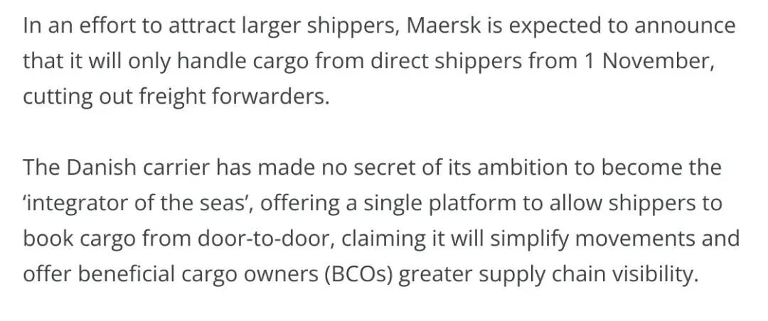 2. 将货代踢出局?11月1日起,马士基只处理直接托运人的货物......