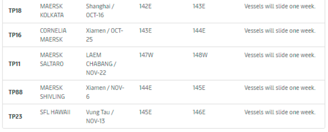 在跨太平洋、跨大西洋、亚洲-北欧和亚洲-地中海等主要航线总共526个预定航次中,在第40周至第43周之间取消了32个航次,取消率为6%。