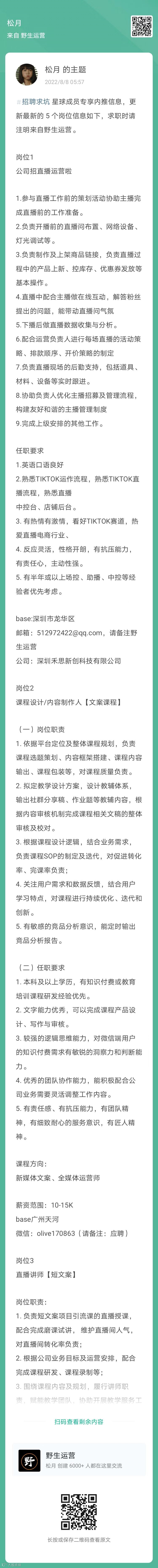 上周更新了 5 个岗位信息如下,求职时请注明来自野生运营,扫码申请岗位👇