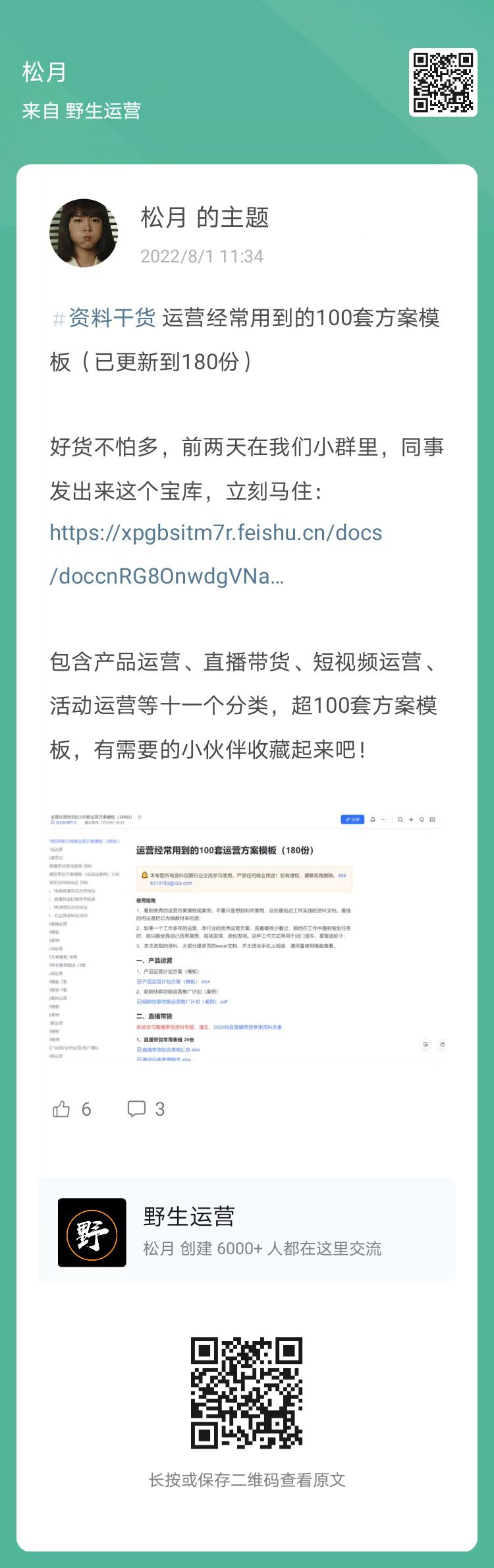 欢迎加入野生运营星球,每周一次快闪分享、运营人学习一手资料、1V1答疑……等硬核干货,而且还能一次入手包括 《2021上半年增长案例合集》、4589 个案例拆解全库、140+ 场群分享的音频+逐字稿、N多运营工具包和资料,就问你一句,值不值?