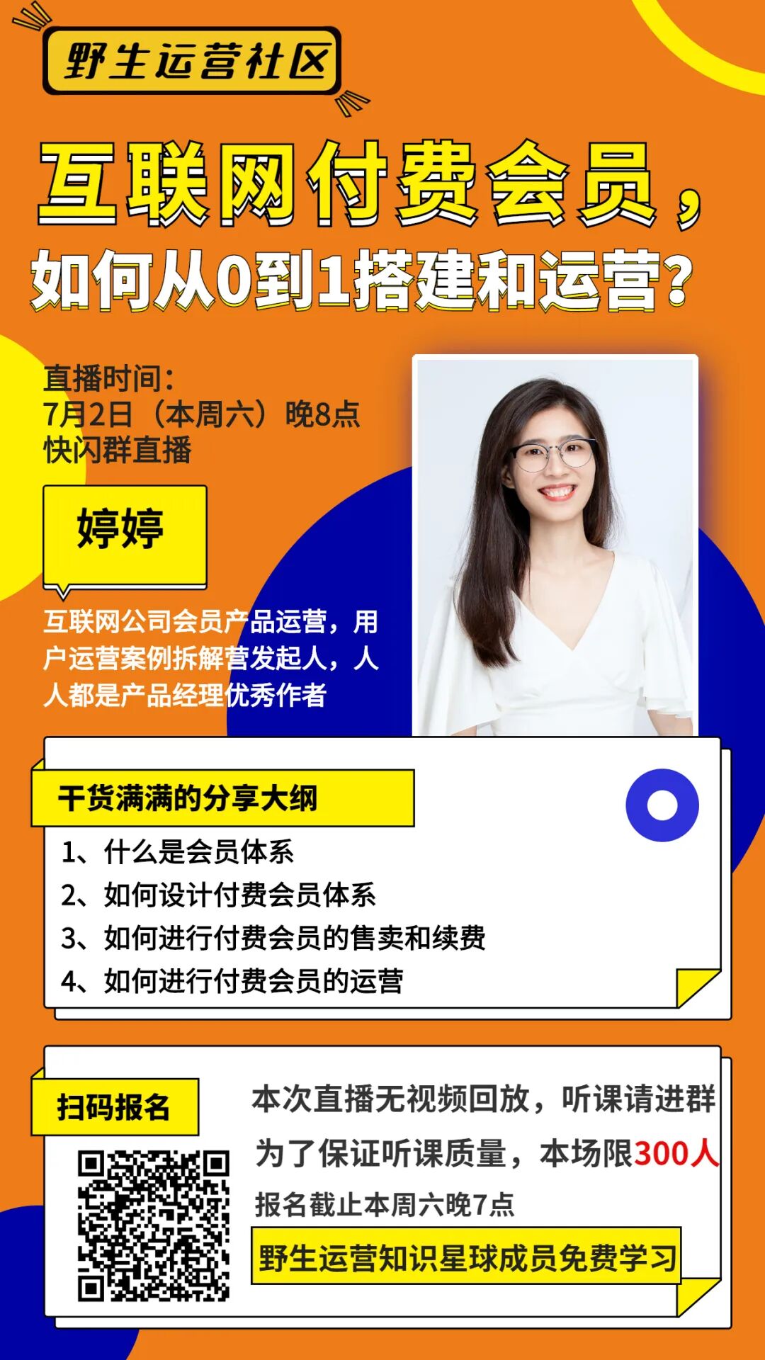本周六晚8点,我邀请婷婷,互联网公司会员产品运营,用户运营案例拆解营发起人,人人都是产品经理优秀作者,带来分享《如何进行付费会员的搭建和运营》。本次分享不设视频回放,报名截止本周六(7月2日)晚7点。