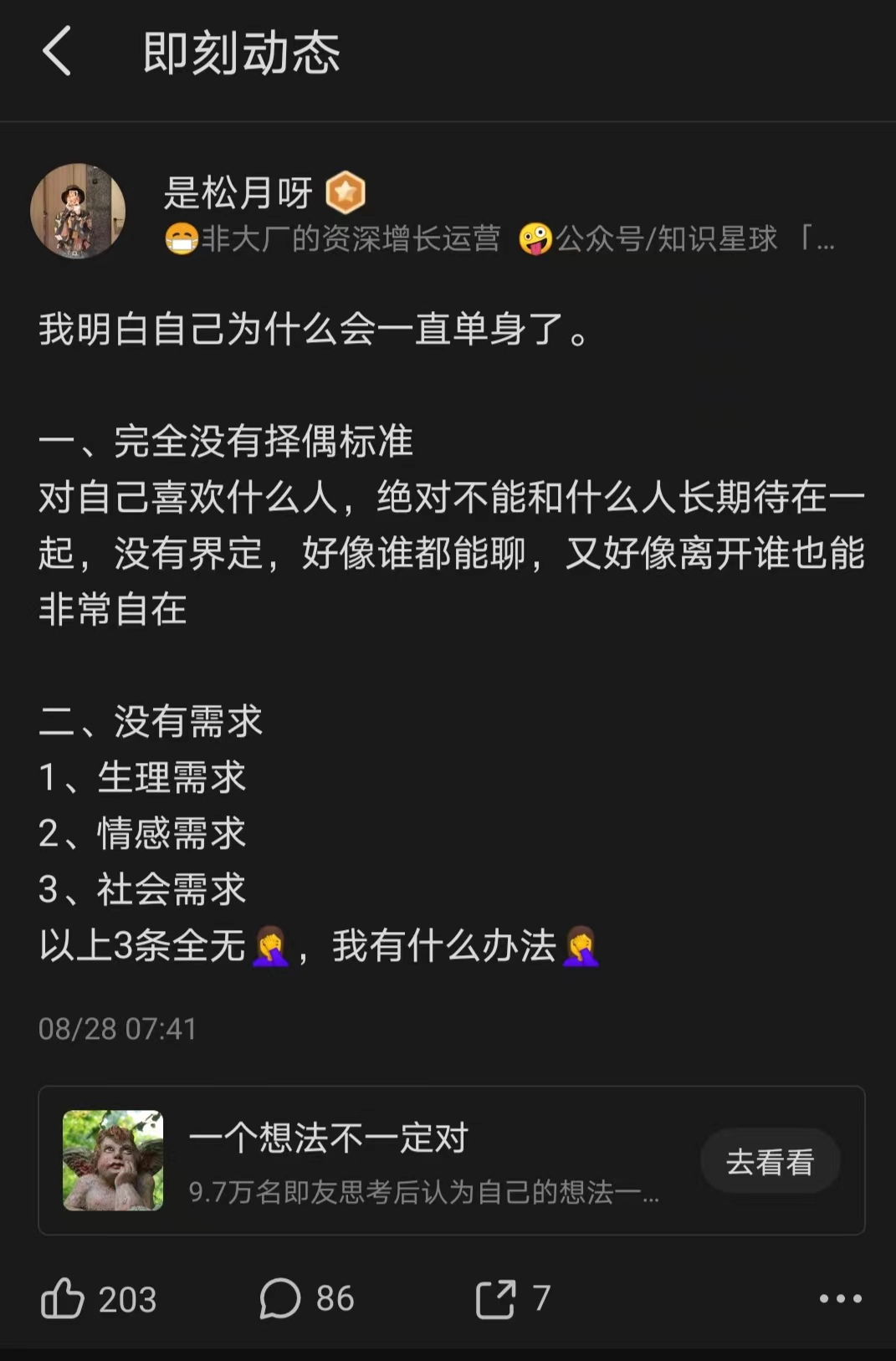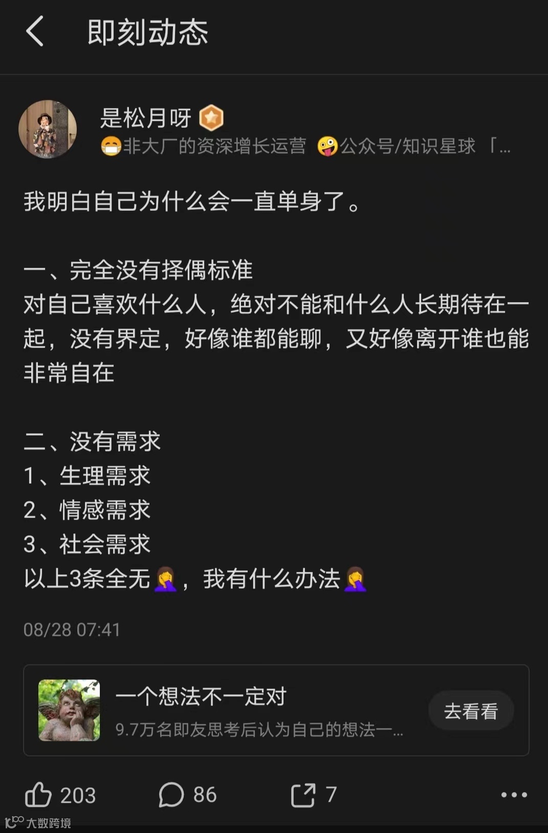 最近一期我们的播客是选题“择偶标准”,又让我陷入了个人亲密关系的思考,先是分析自己为什么单身的原因: