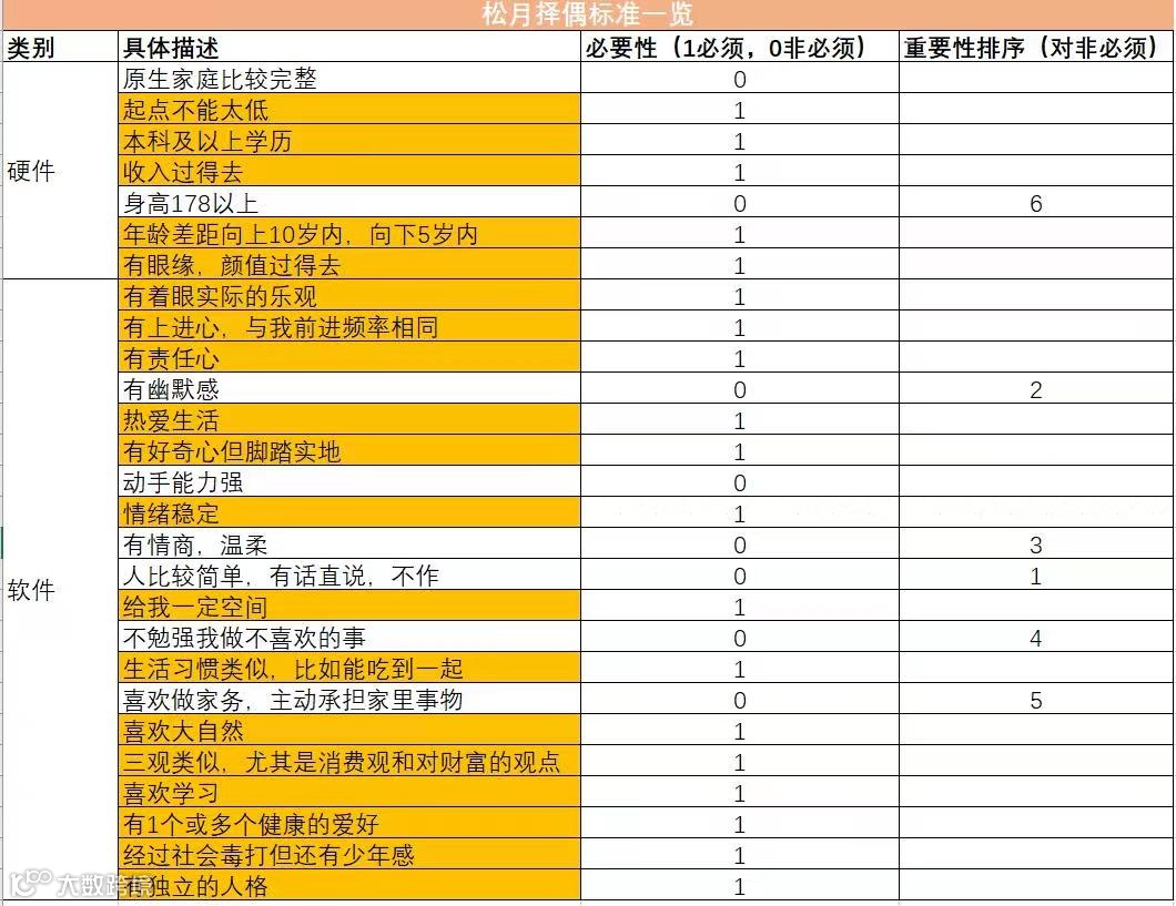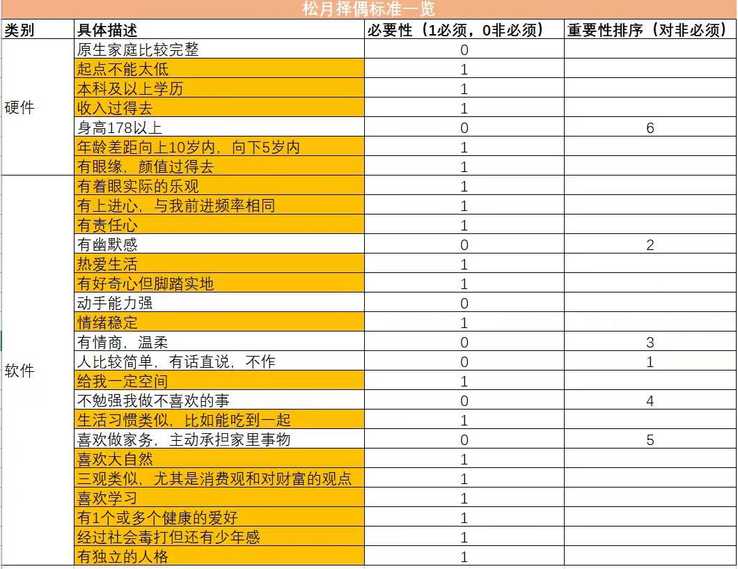 接着正儿八经列了自己的择偶标准,兴致勃勃拿着这张表给朋友看: