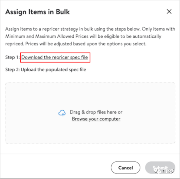 在下一个窗口中,选择下载重新定价器规范文件以开始文件下载。
