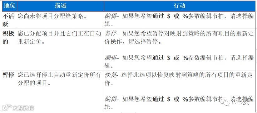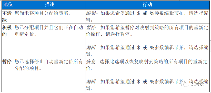 Repricer 仪表板可让您轻松管理您的策略。请参阅下表中的状态、描述和可能的操作。