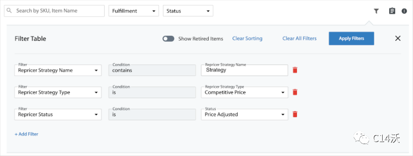 您还可以选择过滤器以自定义项目网格以仅显示重新定价策略名称、重新定价策略类型 和 重新定价状态的结果。