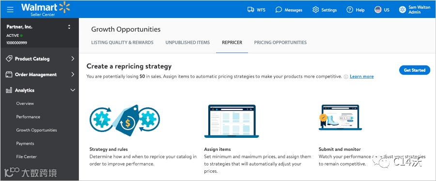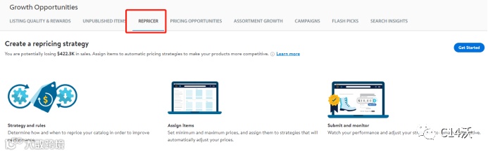 要访问 Repricer 仪表板,请在卖家中心的分析标题下选择增长机会。选择重新定价器标题。尚未使用此程序的卖家将看到以下屏幕。