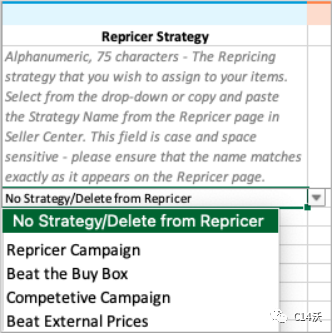 如果您想从策略中取消分配特定项目,请选择分配项目并下载重新定价规范文件。从Repricer Strategy列的下拉列表中 选择 No Strategy/Delete from Repricer 。
