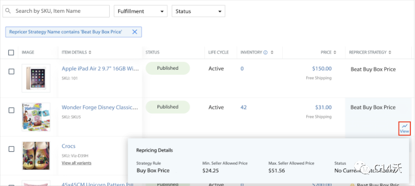 答: 您可以在Items中查看单个 SKU 的 Repricer 详细信息 通过查看 Repricer Strategy 列来控制仪表板。 您还可以在卖家中心或通过 API提供的按需商品报告中查看商品级别信息的完整列表。