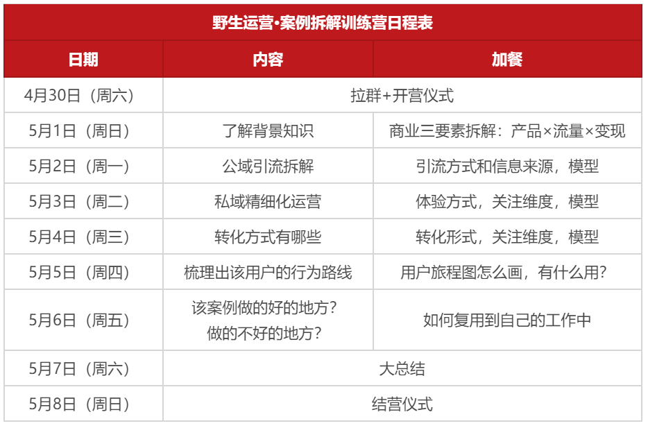 拆解案例活动的最终目的,不是让大家拆解越来越多的案例,而是通过对有限案例的拆解,获得增长底层能力,所以野生运营『全域案例拆解』这 8 天的活动是是这样安排的: