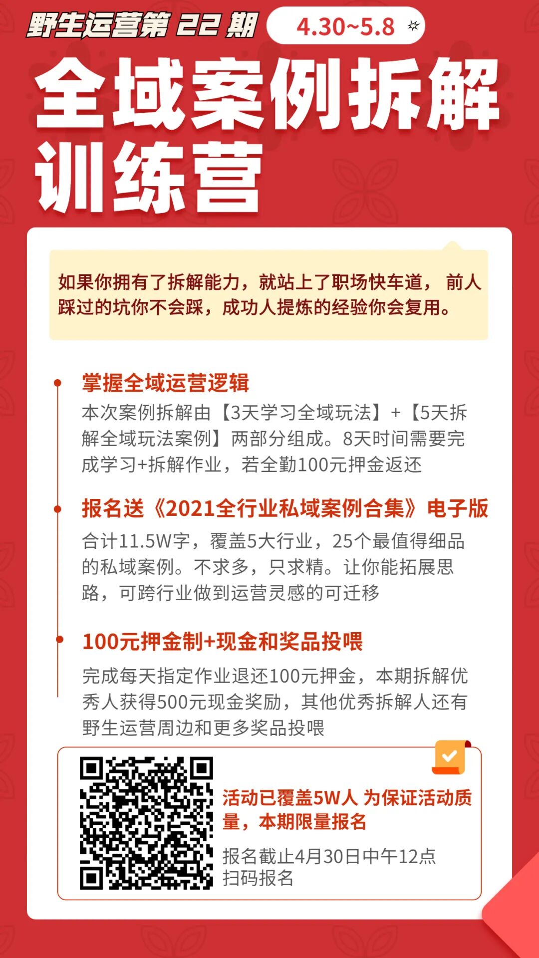 还是回到野生运营所倡导的:最高效的学习方式就是学习别人的成功经验,并举一反三复用在自己身上,从而少踩一些没必要的坑。2022年初始,野生运营案例拆解训练营再次升级,升级为“全域案例拆解训练营”,从公域到私域,从全局到细节,让你看到运营跨平台、跨用户生命周期的全实操过程。具体活动要怎么参与,感兴趣的小伙伴,请继续看下去吧!