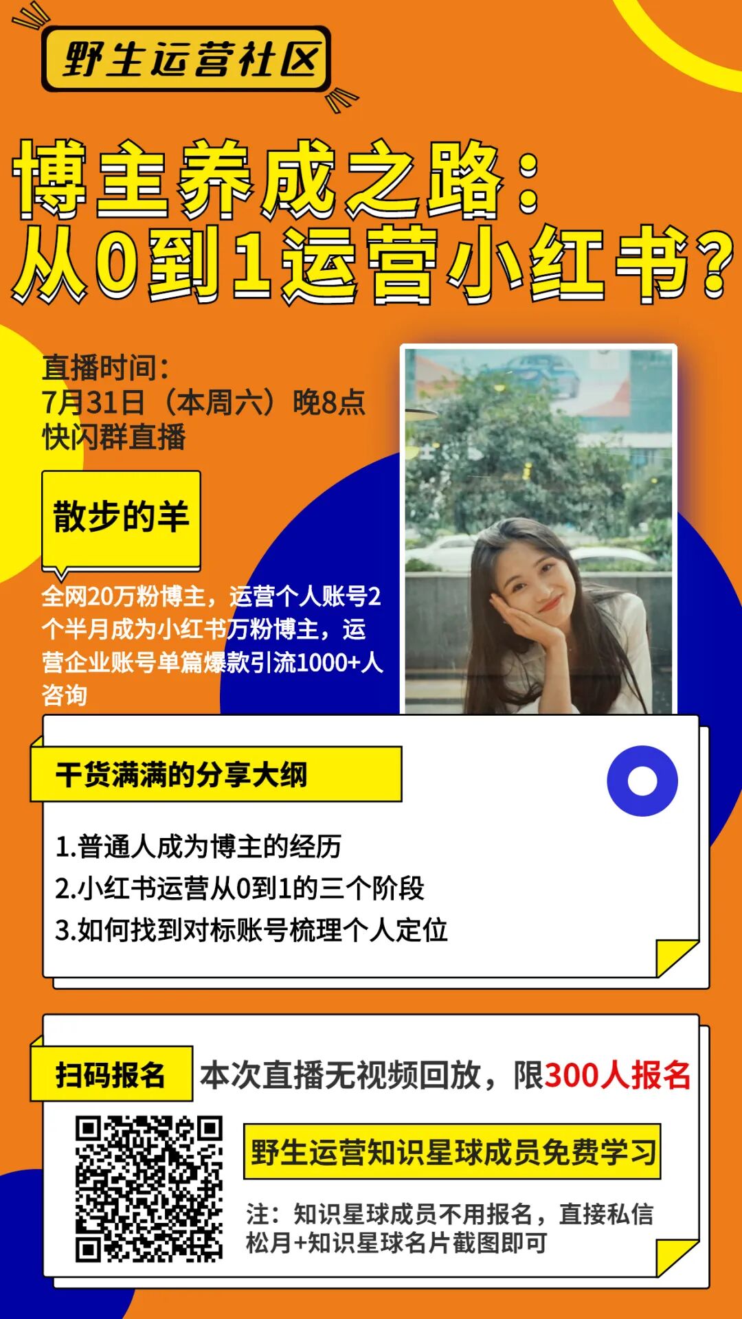 本周日晚8点(敲黑板,是周日!),我邀请散步的羊,独立内容运营,全网20万粉博主,运营个人账号2个半月成为小红书万粉博主,运营企业账号单篇爆款引流1000+人咨询,带来分享《博主养成之路:如何从0到1运营小红书》。本次分享不设视频回放,报名截止本周日(7月31日)晚7点。