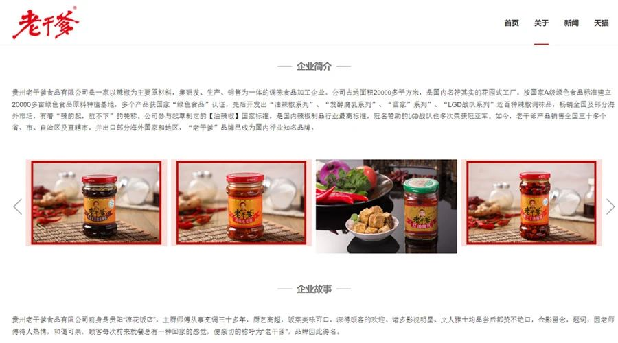 老干爹品牌的前身是1982年创立于贵阳的“流花饭店”。由于饭店里的油辣椒深受顾客喜爱,创始人邓承俊逐渐扩大了油辣椒的生产规模。到了1999年,贵州老干爹食品有限公司正式成立。
