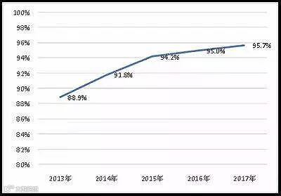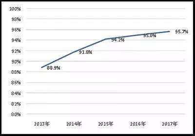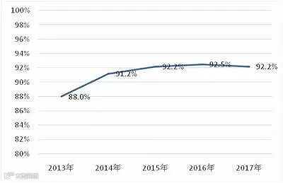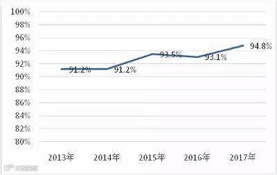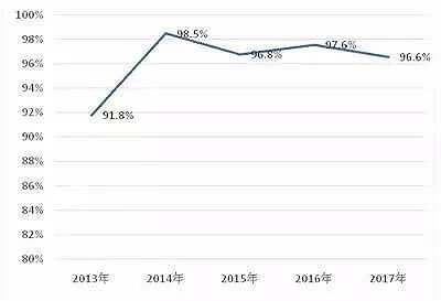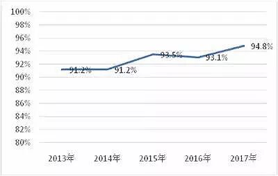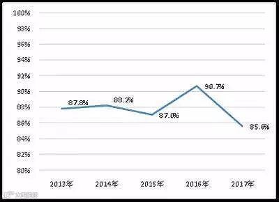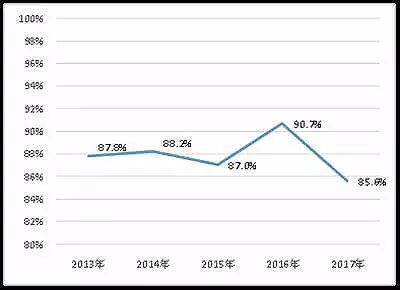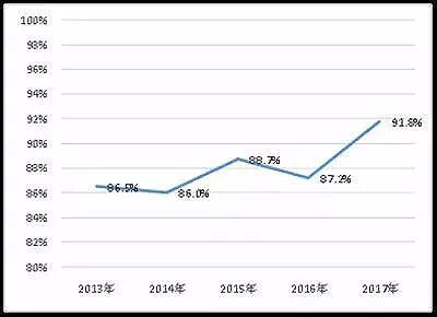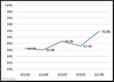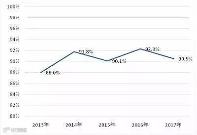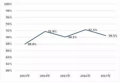 从近5年的抽查情况看,产品抽查合格率分别为88.9%、92.3%、91.1%、91.6%、91.5%,2017年同比2016年下降了0.1个百分点。