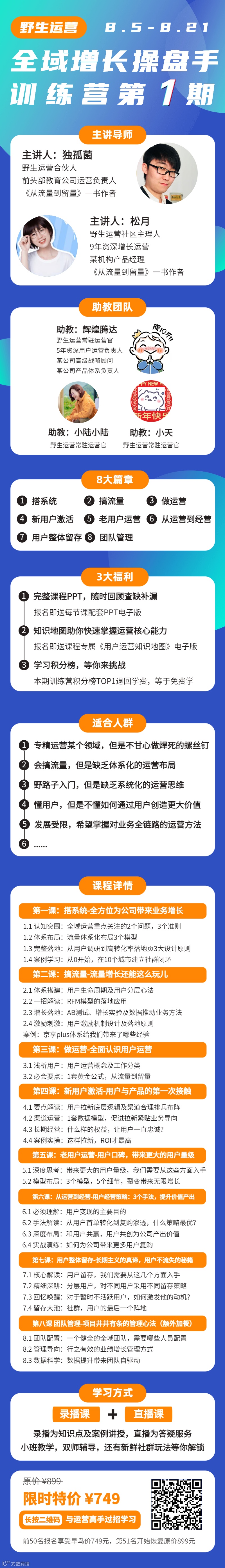 为了应对趋势,野生运营的系统课又又又升级了(没错,这是第 3 次迭代),升级为“全域增长操盘训练营”,加入了流量体系化布局、渠道运营、增长实验及数据驱动、增长项目及团队管理等新内容,等不及的小伙伴戳这里了解课程(前50名报名享优惠价,第51名报名恢复至原价899元):做全域运营,你需要了解的6个问题(送全域增长知识地图)