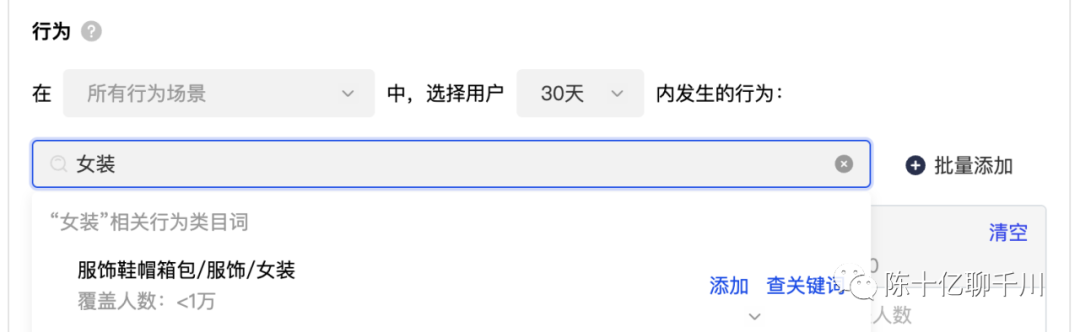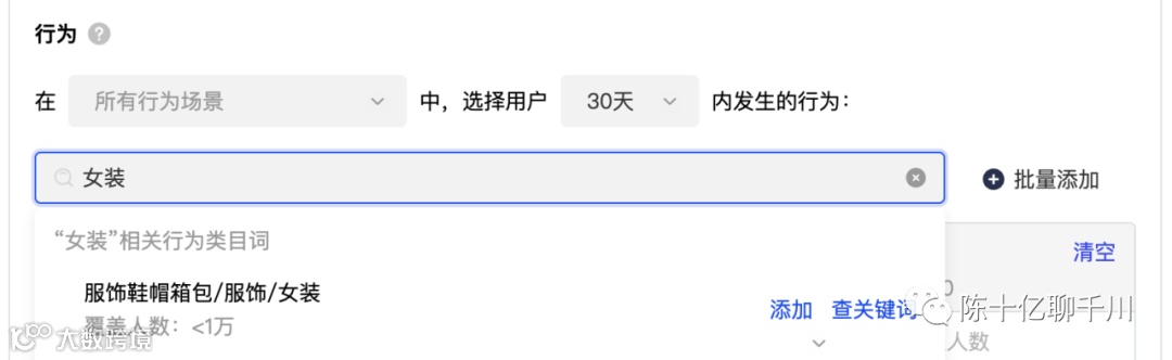 第一是定向中的行为,查找关键词会出来很多,选覆盖人数多的写,都是有这个词的购买行为人群,非常精准。