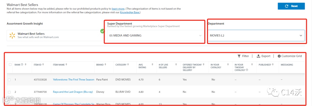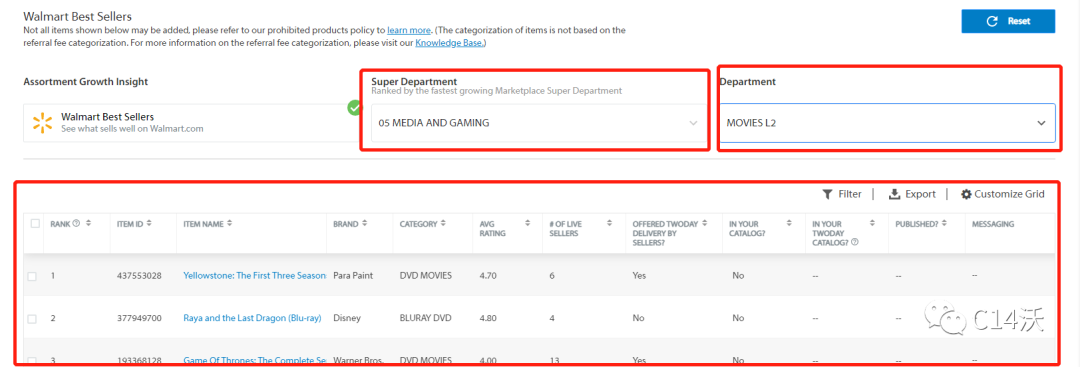 右边我们知道是沃尔玛给的各个类目的best seller,选择类目就可以出来对应的这个品类的best seller,可以作为选品的参考。