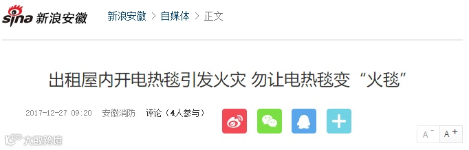 据统计,2017年12月份,湖南共发生居民住宅火灾359起,其中有近一半是电暖气等电取暖设备使用不当引发的火灾。