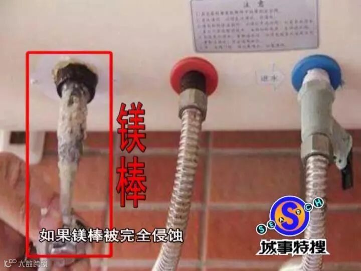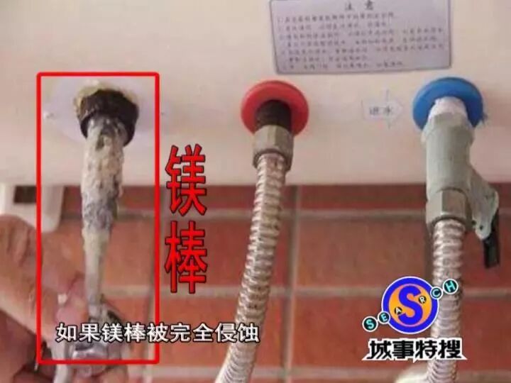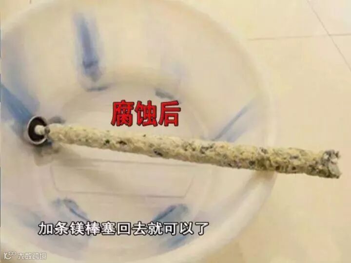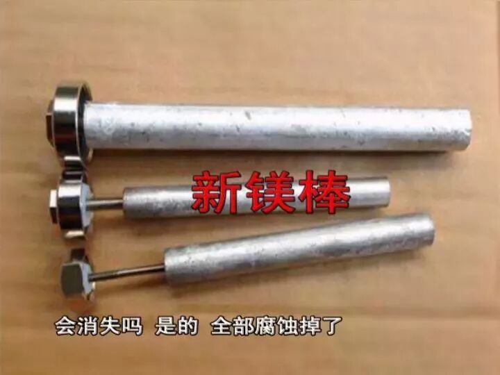 据介绍,这根镁棒会和热水器里的水垢产生化学反应,从而使热水器里因加热产生的水垢不至于结成硬块、包裹在加热棒上,摸上去像水泥一样坚硬。