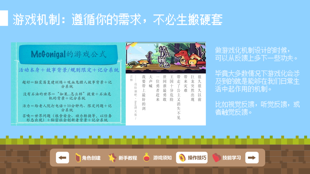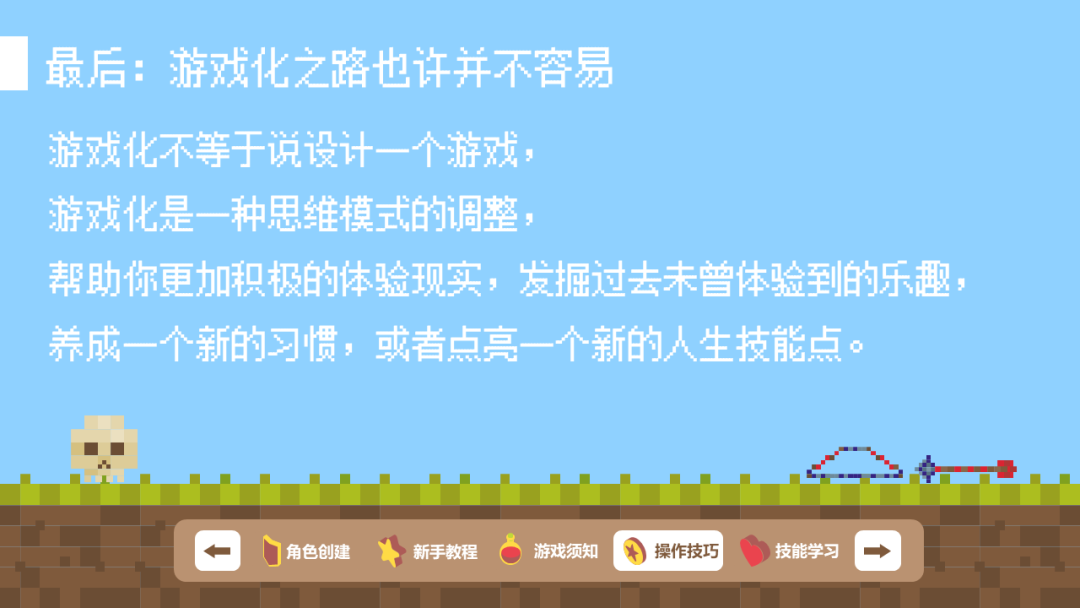 另外一个就是说,游戏化不等于重新设计一个游戏,游戏化是一种思维模式的调整,ta不在乎说你搞了什么机制,而是你是否有考虑清楚希望通过游戏化的形式对他人产生什么样的影响,是更加积极的体验现实,发掘过去未曾体验到的乐趣,还是养成一个新的习惯,或者点亮一个新的人生技能点。
