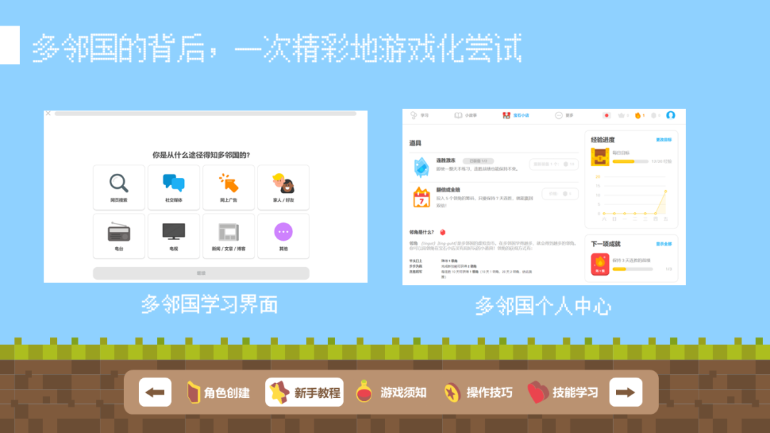 另一方面,多邻国它本身的体验设计就是游戏化的,比如在你刚注册时会让你点选一些emoji模块,这就像你玩游戏时创建角色一样,然后就马上进入学习过程,学习过程也很简单,就是一些简单的点选操作,然后完成了新手任务就会来到新手村,这里会让你创建个人档案,并且提供商店供你购买学习,或者说冒险所需要的道具,还有成就,升级,排行榜,技能树等等,足够让你的学习过程变得好玩有趣。