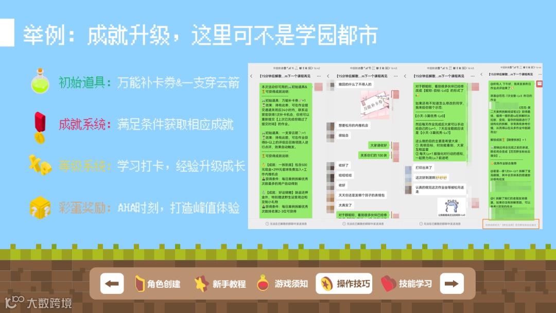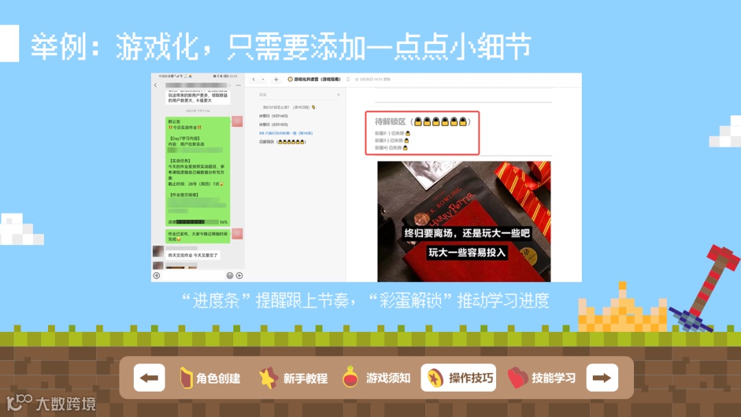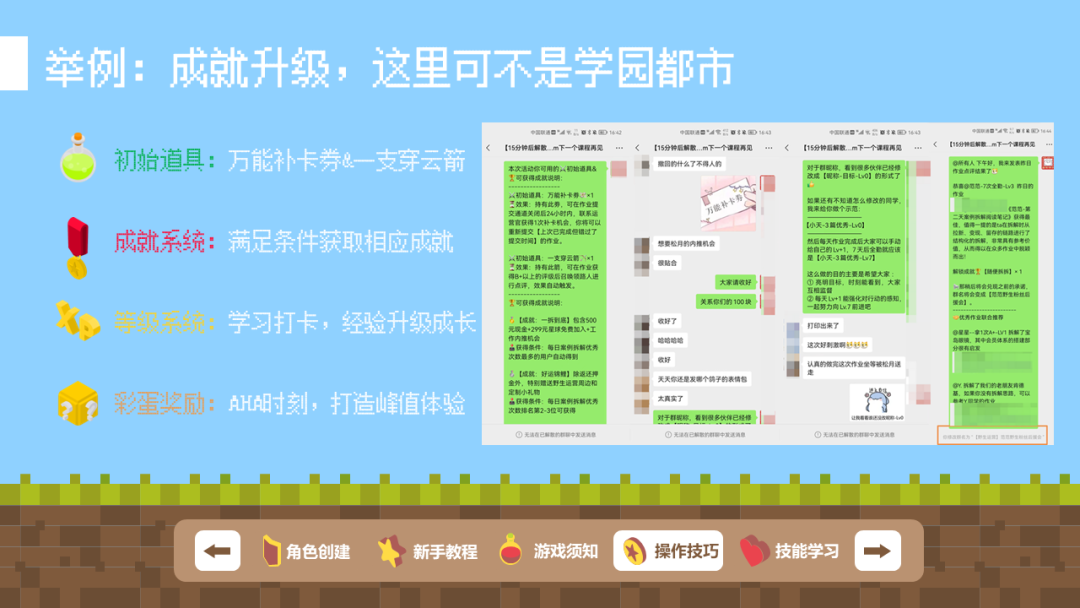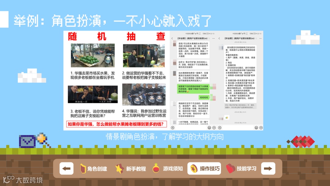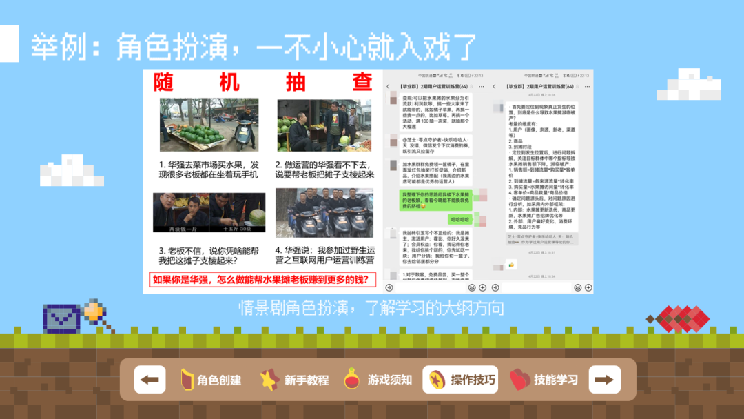 除了上面所述的通过游戏化来对现有机制做一些优化的案例外,也有做过一些角色扮演的游戏化体验设计案例,比如在用户运营训练营导论课学习部分,为了让大家对接下来会学习到到的知识有一个系统性的了解,所以设计了一个场景,让大家以角色扮演的形式去发掘接下来会学到的内容,在整个知识体系中所起到的作用,对自身的帮助等等,起到一个触类旁通的效果。