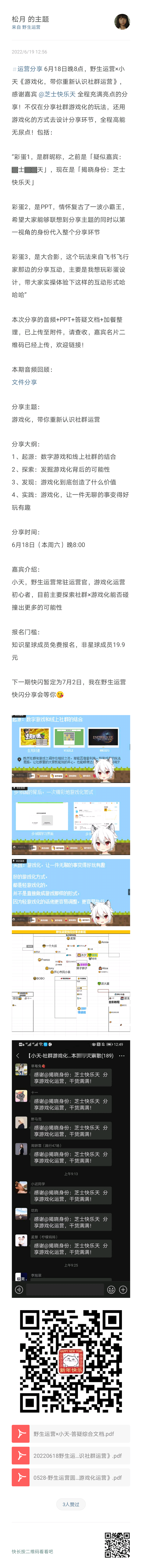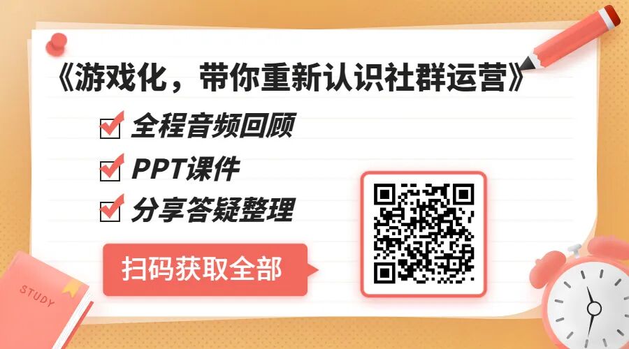 本文来自 @小天 6月18日在野生运营快闪群里分享主题《游戏化,带你重新认识社群运营》,其中的精华内容整理,其中的音频+PPT+答疑稿全部上传,如果想回顾全部,可扫码获取:
