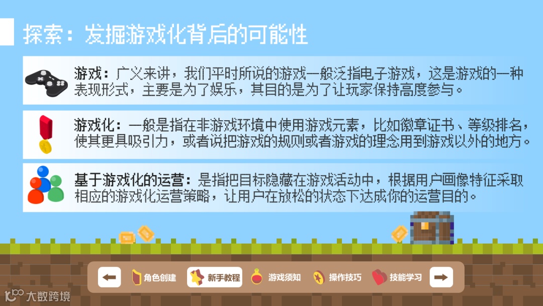 游戏化:一般是指在非游戏环境中使用游戏元素,比如徽章证书、等级排名,使其更具吸引力,或者说把游戏的规则或者游戏的理念用到游戏以外的地方。