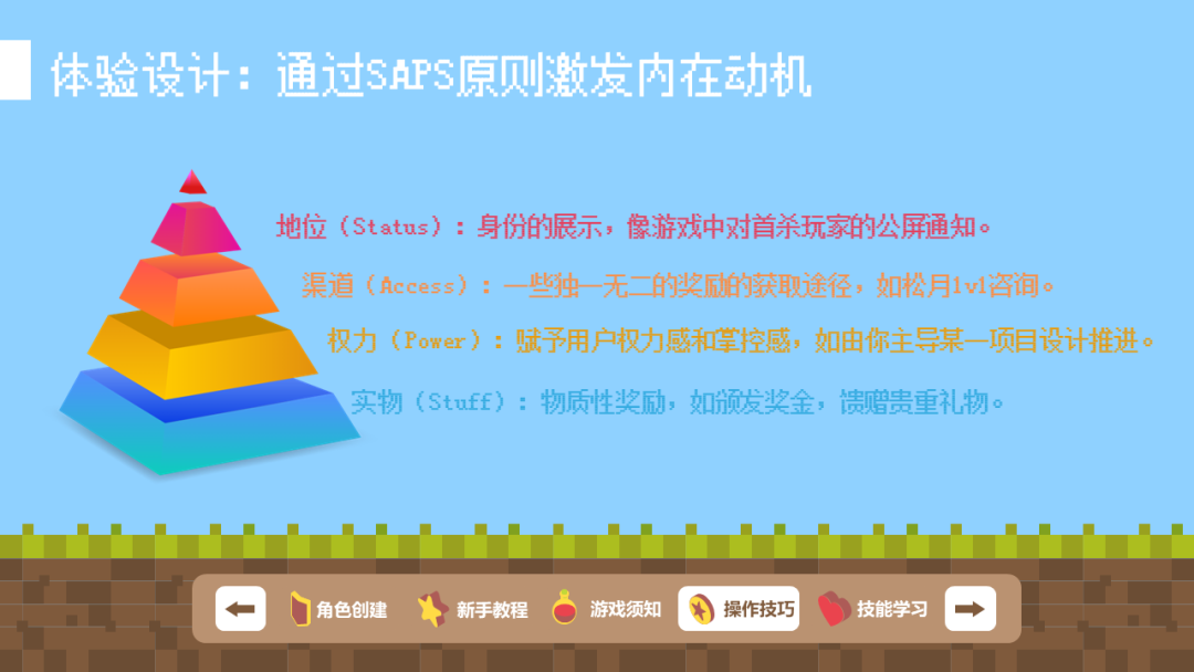 传统的游戏化元素一般由PBL构成,也就是积分、徽章和排行,比起PBL只能激发外在动机,满足用户的短期需求来说,我更倾向于使用SAPS原则来激发用户的内在动机,这套原则本质上是激发用户参与感,通过奖励的设计主动引导用户行动,从而体验到做某件事的乐趣,达成我的一个运营目的。