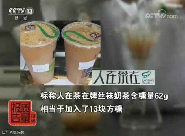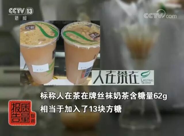 在样品检测环节,通过测算,一杯470毫升标称“人在茶在”牌丝袜奶茶单杯总糖含量达60克之多,相当于13块方糖。