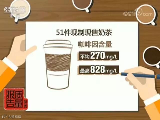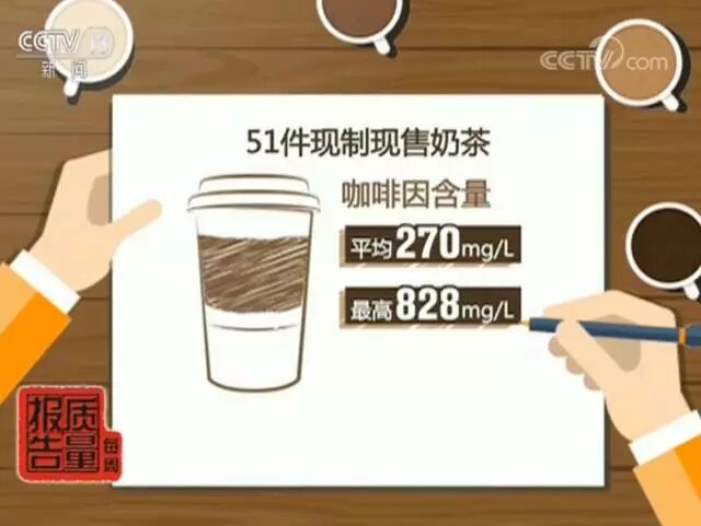 检测发现,51件现制现售奶茶中咖啡因含量平均高达270mg/L,最高达到了828mg/L。