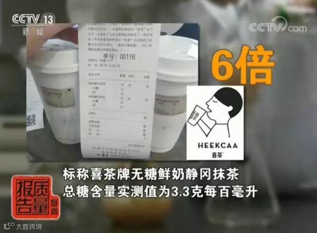 标称"喜茶"牌无糖鲜奶静冈牌抹茶实测含糖量为3.3g每一百毫升,约为参考限值的6倍。