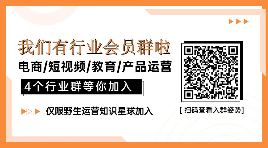 插入一条:野生运营有「行业会员群」啦!目前成立了电商运营(包括线上线下,新消费)、短视频运营(视频号,抖音,快手,小红书)、教育运营(素质教育、职业教育、成人教育、知识付费)和产品运营(SaaS,B端、APP运营)这4个群,身为知识星球成员,还没入群?