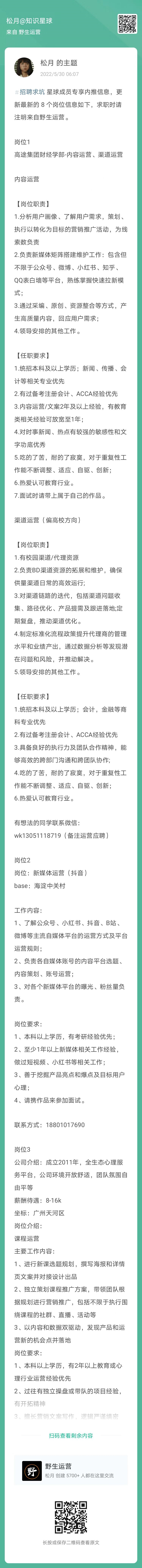 上周更新了 8 个岗位信息如下,求职时请注明来自野生运营,扫码申请岗位👇