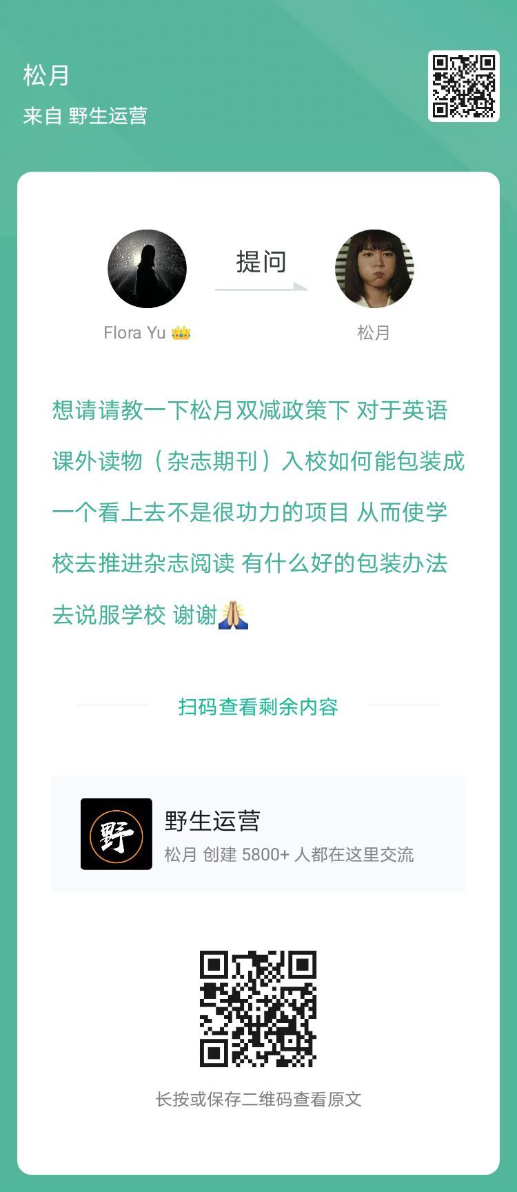 2、提问:双减政策下,入校如何能包装成一个看上去不是很功利的项目,从而去更好的说服学校?(扫码看全文)