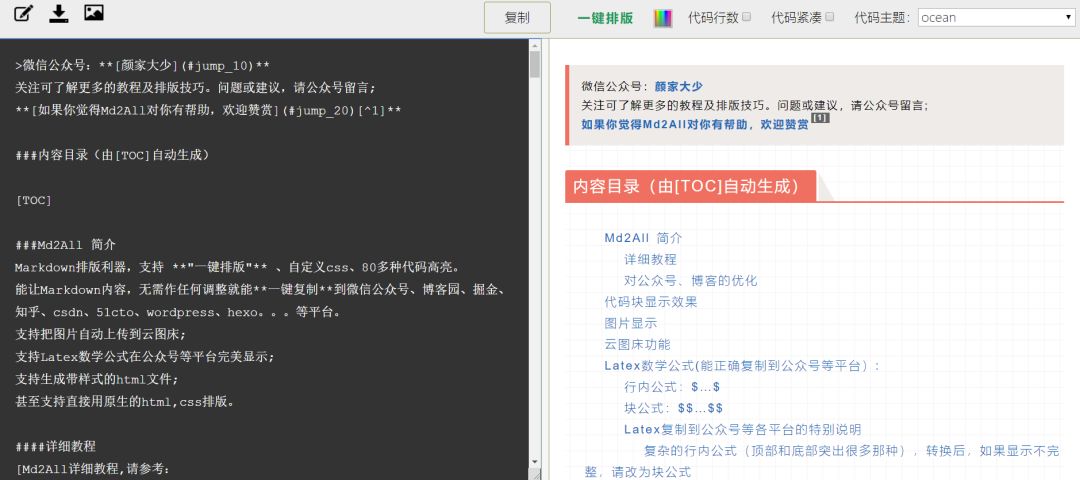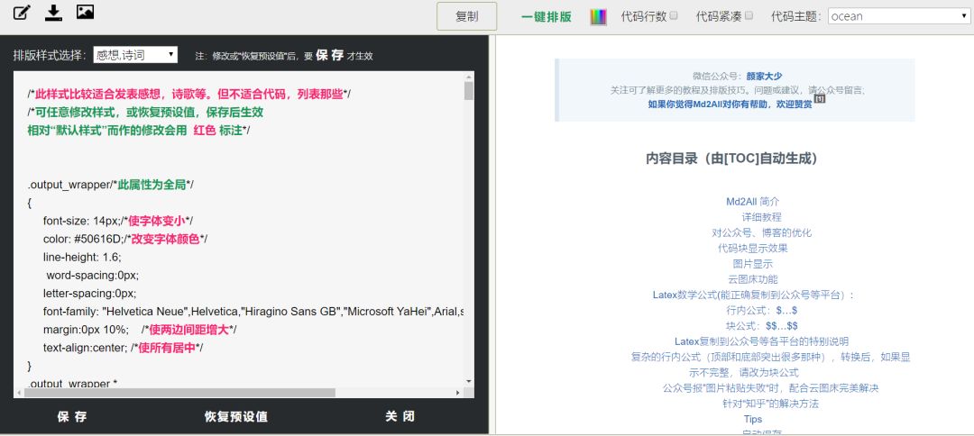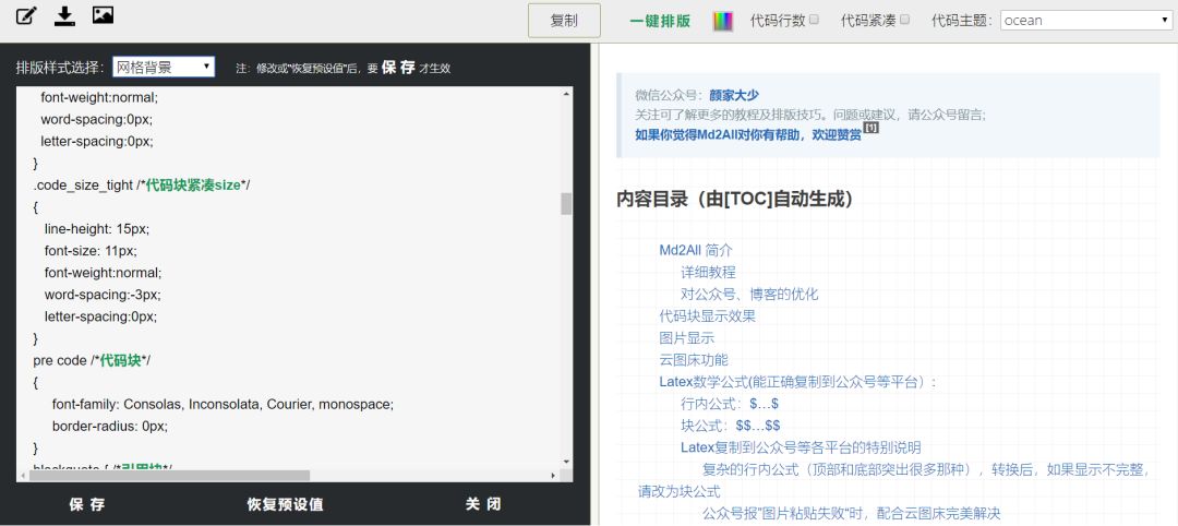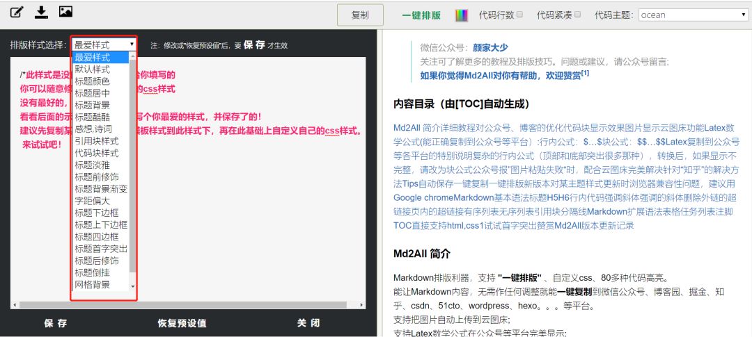 程序员写文章肯定避免不了写代码,但是公众号是没有代码样式的,还记的刚开始在公众号文章里面放代码时,都是直接截图的,现在想想好傻。这款编辑器支持多种代码样式,根据自己的需要选择喜欢的即可,我公众号用的是ocean样式。