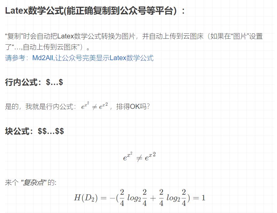 写机器学习算法文章的人,肯定会涉及到很多很多数学公式,同样公众号是不支持Latex数学公式的,现在市面上一些其他markdown编辑器虽然支持,但是复制到公众号里面会出现错行情况。这个编辑器的Latex公式可以完美复制到公众号,这个功能还是我和原作者提的需求哈哈哈。