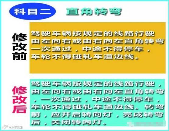 比如科目二直角拐弯项目,此前的规范是:驾驶车辆按规定线路行驶由左向右或由右向左直角拐弯一次通过,中途不得停车,车轮不得碰轧车道边线。新的标准则在此基础上要求“ 应开启转向灯,完成转弯后关闭转向灯。”