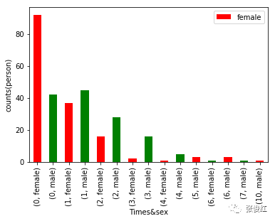 除了追过人数为0次时对应的女生人数要多于男生,追过次数为1-4次中男生对应的人数都要高于女生,而5次以后又被女生反超。